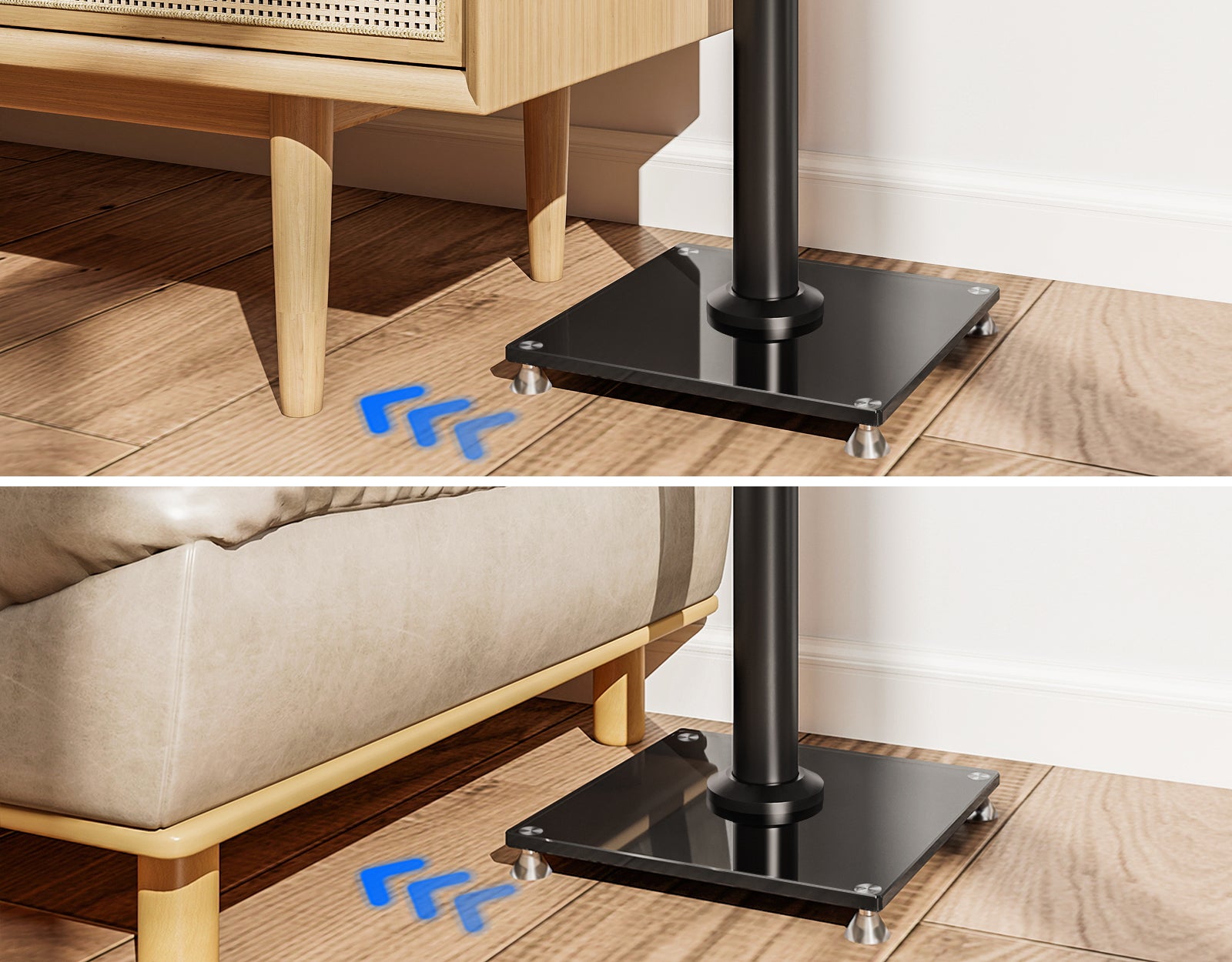 Compared to other products with an iron base, our floor speaker stands are made of premium alloy steel and an 11.81" one-piece molded glass base, which is not only stable, strong and durable, but also more beautiful; The strong construction can support speakers weighing up to 22 lbs; Our speaker stands are absolutely reliable.
