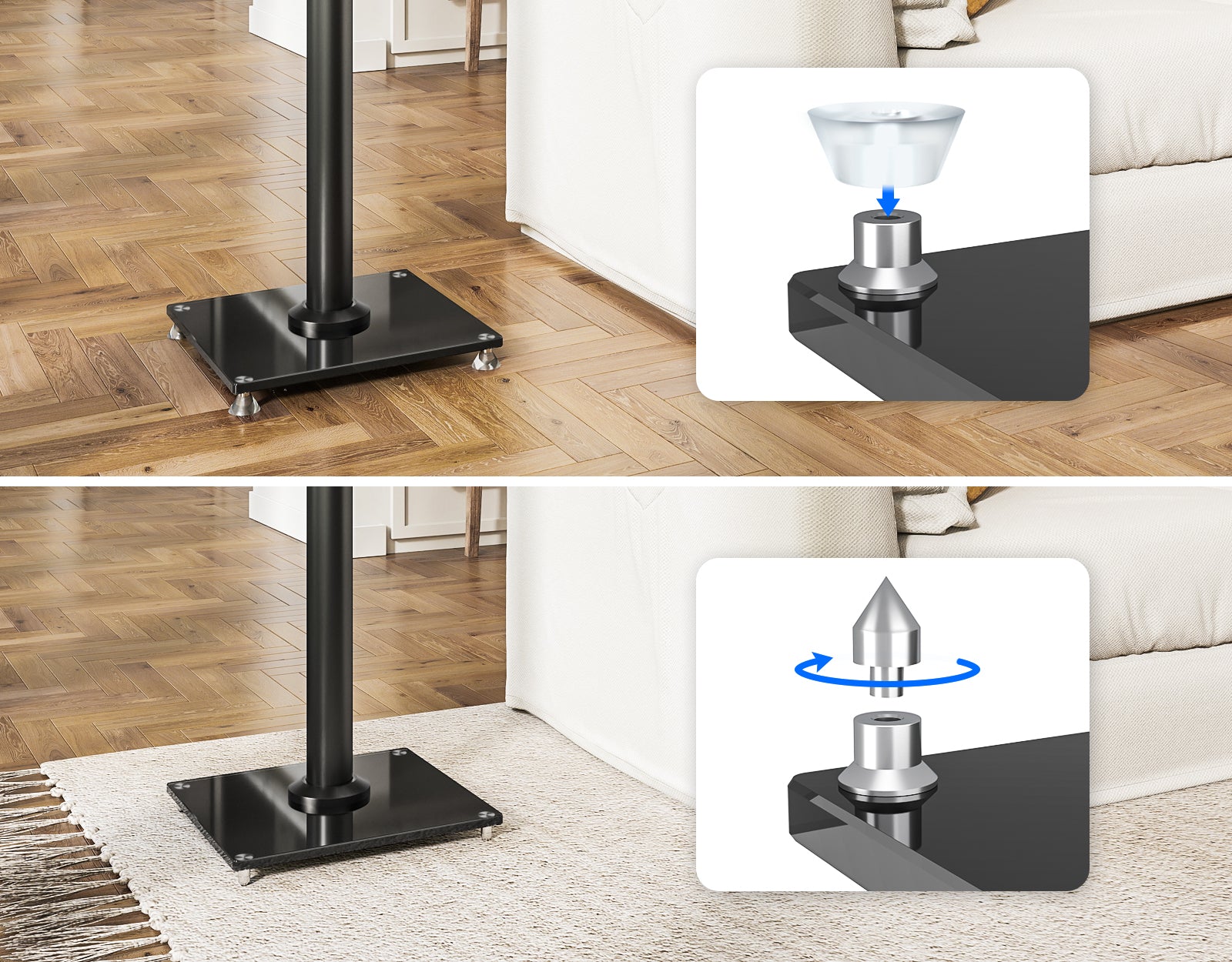 Bookshelf speaker stand is provided with two kinds of feet (metal feet and rubber feet), which can be freely installed as needed; Whether it's the wood, concrete, tile floor or carpet, it will protect your cherished floor or carpet from scratches; The 7.8 inch square glass top plate with rubber pad ensures the stability of your speakers to reduce vibration for better sound quality; A beautiful addition to your audio system.